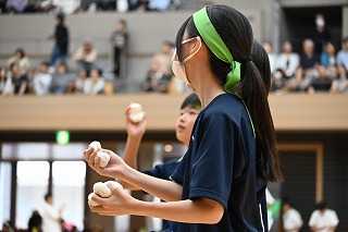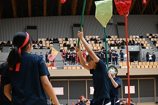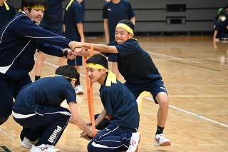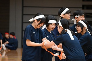 体育祭1年生種目は、「キャタピラリレー」と「おじゃま玉入れ」でした。 「キャタピラリレー」は4人組で、前後2人ずつでひもをキャタピラのようにして進むリレーでした。「おじゃま玉入れ」は各クラス、全体で発表された個数をかごに入れることを目標にして、ほかのクラスが玉をはじき落とすことのできる玉入れです。