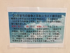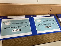 太平洋戦争終了80年を機に、1年生が「わがまちの戦争と平和」をテーマに社会科の課題に取り組みました。博物館訪問や地域の方からの聞き取りを通じて、「何のために学ぶのか」を深く考察。各自の調査結果を6~8枚のスライドをつくりました。1ページずつ丁寧にまとめながら、仲間との対話を通じて「平和への思い」を深めるきっかけとしました。