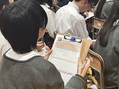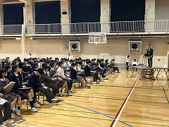 3年生に第2回の高校ブリッジプログラムを開催しました。高校での学びをテーマに、高校英語・数学の教員がこれからの授業の仕組みや流れと今頑張ることを教えてくださいました。 高校からではなく、今から始めようとの激励に、決意をもってしっかり聞いていました