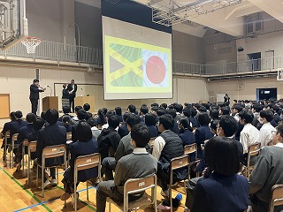 生徒からは、「ジャマイカと日本が60年以上も友好関係を続けていることを初めて知り、驚きました」「国旗の色にそれぞれ深い意味があることや、日本にだけ輸出している西インド海島綿があることなど、知らなかったことをたくさん学べました」「クイズやレゲエダンスを通じて、楽しみながらジャマイカの文化を体験できました」「ディクソン一等書記官の明るく親しみやすいお人柄に触れ、言葉や文化が違っても心は通じ合えると実感しました」「世界市民として、異なる文化を理解し尊重することの大切さを学びました」などの感想が寄せられました。